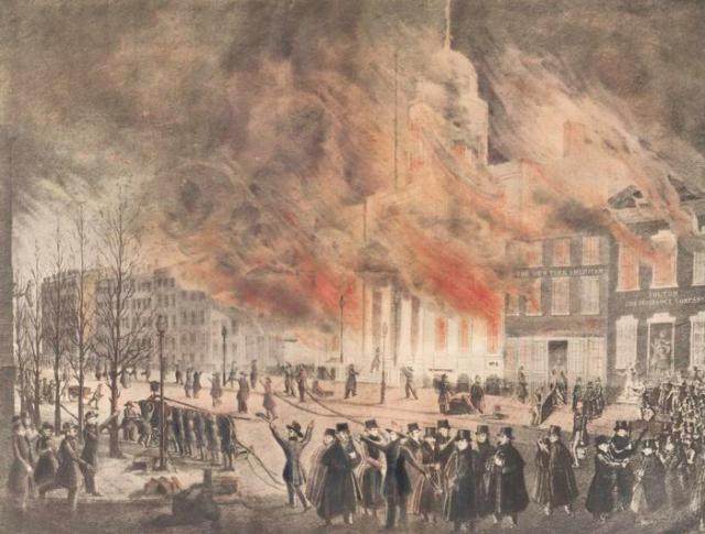 In the end, the fire had to burn itself out and, in the process, it destroyed much of the area between Broadway and Pearl Street in the financial district. If you happen to be down in that neighborhood, take a walk down the block of Stone Street that connects Hanover Square to Coenties Slip. This is the area known today for its string of restaurants and pubs; the buildings themselves, however, form a sort of memorial to the fire. Almost all of them were built within a 12-month period in 1836-37 to replace countinghouses and warehouses destroyed in the Great Fire. Notice how many of the buildings have extra wide doors (to haul in cargo) and strong, granite curbs to keep goods from accidentally plunging in to the basement.