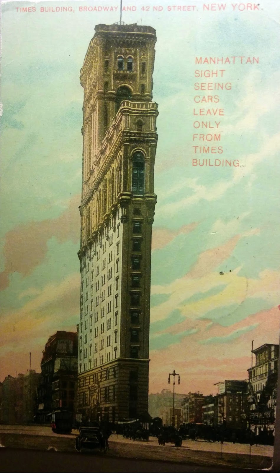 In 1877, a ball was added to the top of the Western Union Building on Lower Broadway. (We couldn't find a postcard of this building in our collection; the above stereo slide from the Library of Congress will have to do.) Each day at noon, a telegraph signal from Western Union’s main office in Washington, DC, would trip a switch in New York and the ball would descend from the flagpole. Visible throughout the Financial District—and, more importantly, from all the ships in the harbor—it allowed people to reset their watches and ship chronometers. For the first time, New York ran on a standard time.