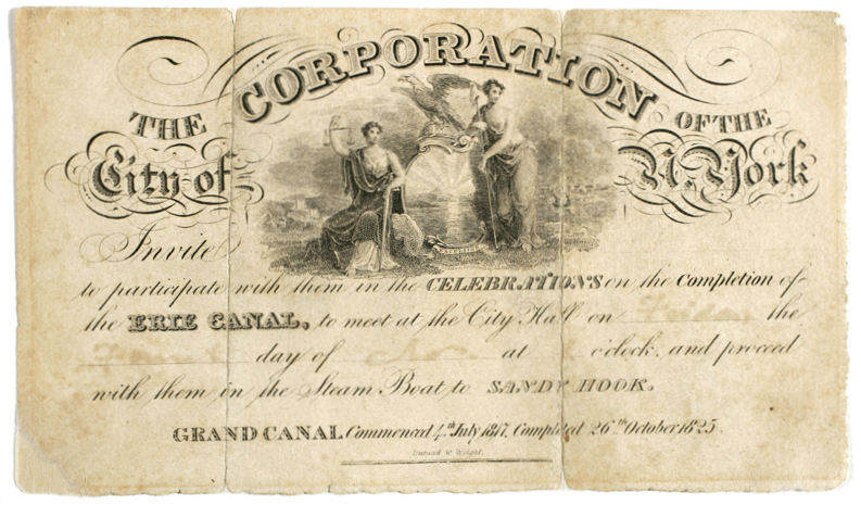 On November 4, 1825, in a ceremony for dignitaries and the press, Governor Clinton poured a small cask of water into the Atlantic Ocean. An artist captured the moment: Clinton stands on the edge of a barge, the miniature cask grasped in his hands, as the water—collected ten days earlier in Lake Erie—gracefully cascades into the sea.