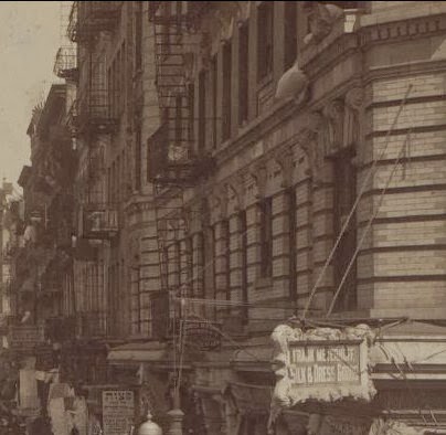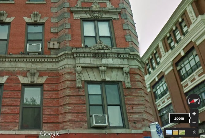 At first glance, the building on the right in the Google Street View doesn't look all that much like the one from the postcard, but we did a little more digging and were able to find a black-and-white photograph of the same scene (on which the postcard is based) at the New York Public Library: