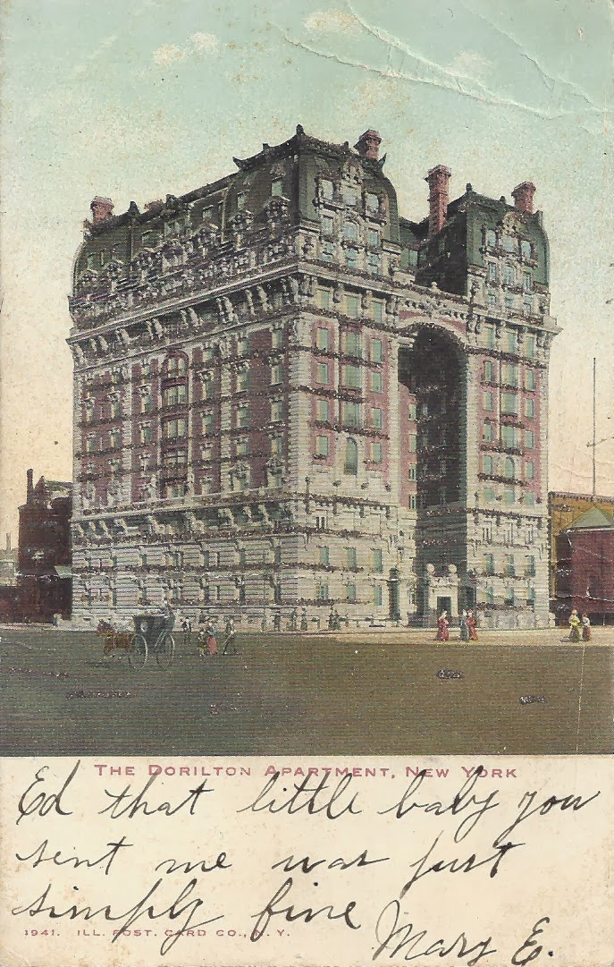 Here's a charming shot of the Dorilton (171 West 71st Street), probably taken not long after its completion in 1902. Like the nearby Ansonia, the Dorilton was built to draw wealthy New Yorkers uptown in anticipation of the completion of the first subway line, the IRT (today's 1/2/3 trains). The fact that the 72nd Street station was going to be the first express stop on the Upper West Side made the Dorilton's location particularly enticing. It would be one express stop down to Times Square, two to Grand Central, and three to Union Square. (In those days, the IRT cut across 42nd Street and headed south from Grand Central along the 4/5/6 tracks.)