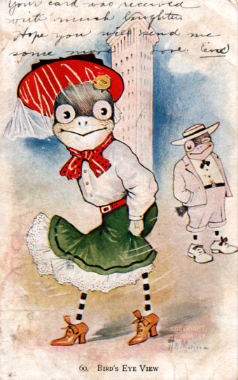 This postcard was made in 1908 and shows two birds ("Bird's eye view"--get it?) outside the Flatiron building at Fifth Avenue and Twenty-third Street. Because of the Flatiron's unique shape and its location along a broad crosstown thoroughfare, strong winds swirl near its base. When the building first opened, men used to flock to Madison Square to watch women walking by in the hope that the air currents would sweep up their skirts and reveal a glimpse of stocking.