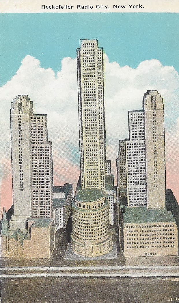 The second postcard depicts the center as actually built. At the front are two of the center's international buildings, La Maison Francaise and the British Empire Building. These two short office towers are one of the topics of our Rockfeller chapter in Footprints in New York.