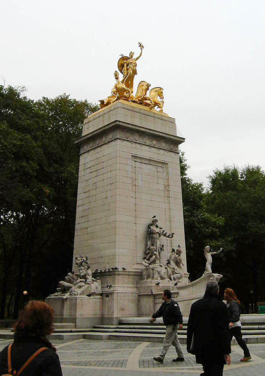 The figural group at the front of the statue (pictured above) is called The Antebellum State of Mind: Courage Awaiting the Flight of Peace and Fortitude Supporting the Feeble (we kid you not), and represents America preparing for war. Once upon a time, the young man on the prow of the ship would have clutched a sword; it was stolen years ago.