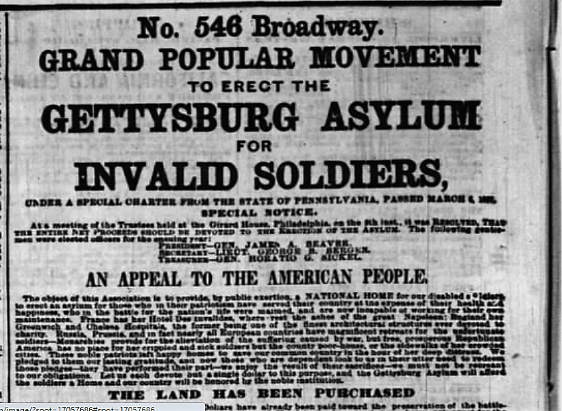 In the aftermath of the Civil War, the number of men who had suffered debilitating wounds was staggering and the need to do something for them was great. Nearly 300,000 Union soldiers had survived gunshot wounds and nearly 30,000 had suffered amputation. Disease, the greatest killer of Civil War soldiers, probably disabled even more than battle wounds.A home for wounded and disabled veterans seemed necessary and in the 1860s, as this advertisement attests, fundraising for the project was moving forward quickly. The site, on the very spot where one of the war's most important conflicts took place, seemed fitting. What could go wrong?
