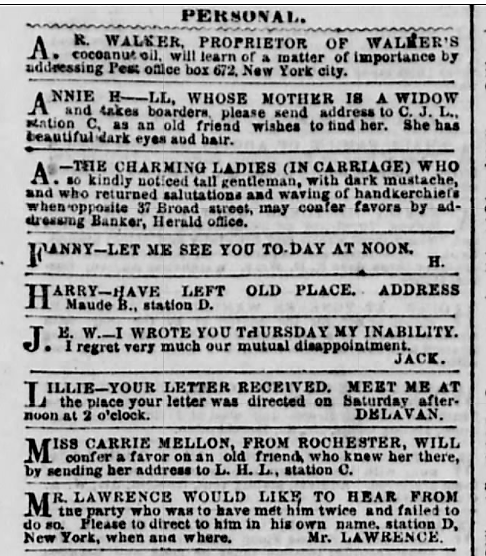 These personal ads graced the front page, first column, of The New York Daily Herald on February 1, 1868 -- exactly 150 years ago today -- and give an insight into how New Yorkers who were not personal friends communicated in the age before Snapchat and dating apps. What makes them so tantalizing is that each advertisement had to be pithy and include only as much information as to make it relevant without revealing anyone's true identity. (Much like Twitter would be if Twitter wasn't a morass of political name-calling.)