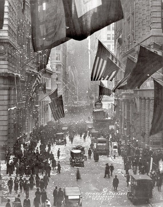 The photo above shows Wall Street in 1918 celebrating the end of the war with a spontaneous barrage of ticker-tape.