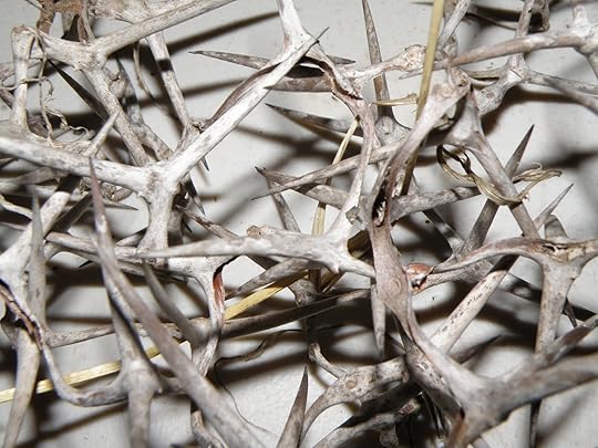 They interest me for a hundred reasons. These are old thorns I have kept for years, watching them change with age. They were broken off their tree in a windstorm many years ago. The tree recovered. These could not. They are long dead but still dangerous.