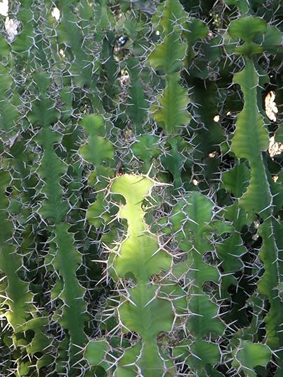 This is the mother plant that lost her limb in the wind storm......and it was interesting to watch her recovery.The damaged limbs were still alive but none of them ever healed over. None of them could repair themselves and they just dropped to the ground, leaving little scars behind on the big plant and the brittle pile of thorns I saved to see how long they would last. The answer appears to be this: