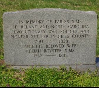 Pariss Sims died in 1833 and is buried in English Cemetery, Campbellsville, Giles County, Tennessee.
