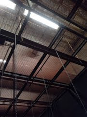Looking into Auditorium's vaulted spaces 50 feet up, near catwalkWe collected one story about a janitor who, in the early days of theater operation, had fallen to his death from the catwalk, housed some 50 or 60 feet above the main stage. So far, we haven't been able to confirm this story, but it may explain some of the activity staff and students related.