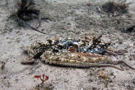 I wrote a post in September about a trip we made to two octopus sites, Octopolis and Octlantis in Jervis Bay, back in February. Octopolis was very quiet, with just two or three octopuses in residence. Octlantis had more going on, with five on-site, another nearby, and a couple of notable behaviors. This post is about the behaviors.