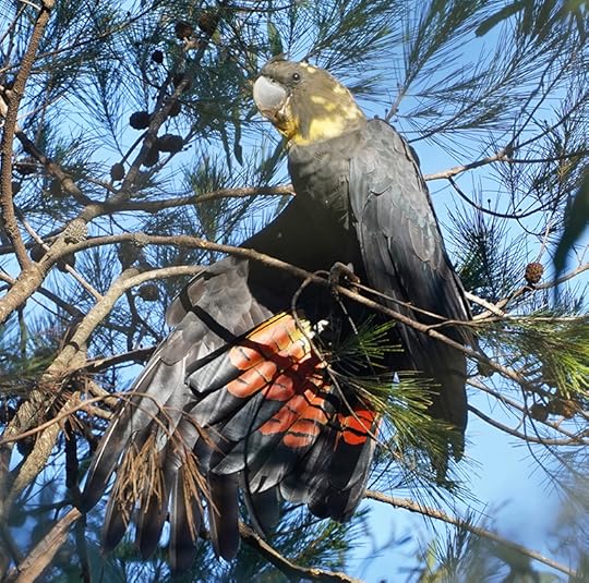A couple of posts back, I described a lyrebird who took a bath in a stream, preened extensively, and then set himself up on a tree overlooking the Jamieson Valley in Australia’s Blue Mountains. I compared the overlook to a cloud, in the light of the soft pillow of needles from casuarina trees on the ground. I went back to the same place the next week, hoping for lyrebirds, and found in those trees a pair of the greatest of all lovers of casuarinas – Glossy Black Cockatoos.
