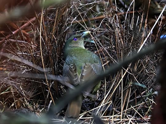 A bower tends to have a pair of gently curved parallel walls, made from twigs and stems of various kinds. The twigs are placed and adjusted carefully, and, I read, a “mixture of chewed vegetable matter and saliva” is used to paint the bower’s walls. (...