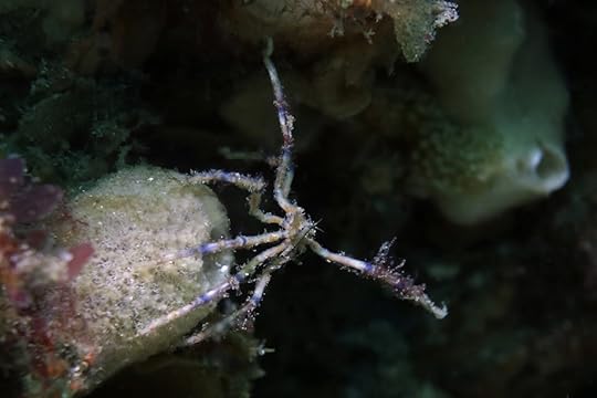 The spider-like animal in the middle of the photo is a blue-knee sea spider. Sea spiders are not exactly spiders, but they are probably moderately close, in evolutionary terms, to land spiders – arachnids. This species is common and the photo above is a pretty poor one, but there’s something to see if one looks closely. Right on top of the spider, as if riding in a saddle, is another animal, wearing (or comprising?) a slender grey tube with three tent...