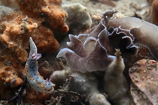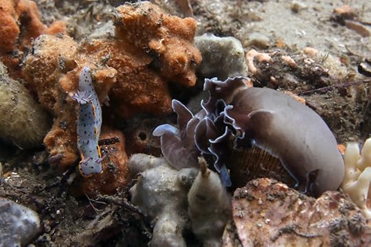 On the left, above, we have Hypselodoris bennetti, a nudibranch; on the right, much larger, a Rose Bubble Shell, Hydatina physis. I came across them at Nelson Bay. The initial scene was like this: