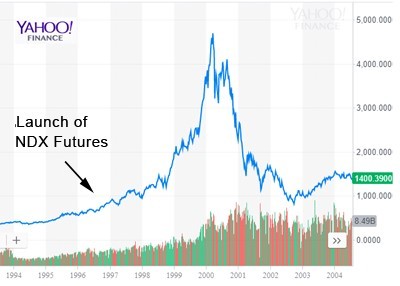 Curve fitting is a popular sport among those prone to being fooled by randomness, and the best way to win is by leaving out examples that disprove your thesis. So while the FRBSF paper sites other markets, like housing, that topped out with the introduction of new derivatives, it conveniently leaves out the case of the Nasdaq 100 stock index.
