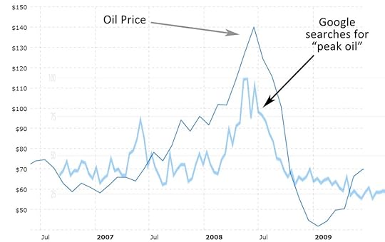 For a simple example of this phenomenon, consider the oil bubble and crash right before the financial crisis. During the bubble phase, when the price of crude climbed from $60 to $150, there was a constant stream of news articles on “peak oil” — the belief that we were nearing max global production. But when the price crashed all the way down to $30, mentions of that topic almost entirely disappeared. Here’s a chart of google searches during that period vs. the price of oil.