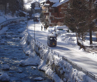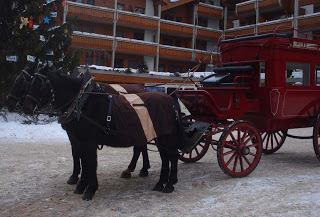 Zermatt - some hotels pick up guests from the Bahnhof (station) in carriages that look like the Wells Fargo stage in cowboy films. The thunder of hooves and rolling wheels as they trot down the snowy streets is exciting to watch, and then the whiff of horse as they go by - wonderful!