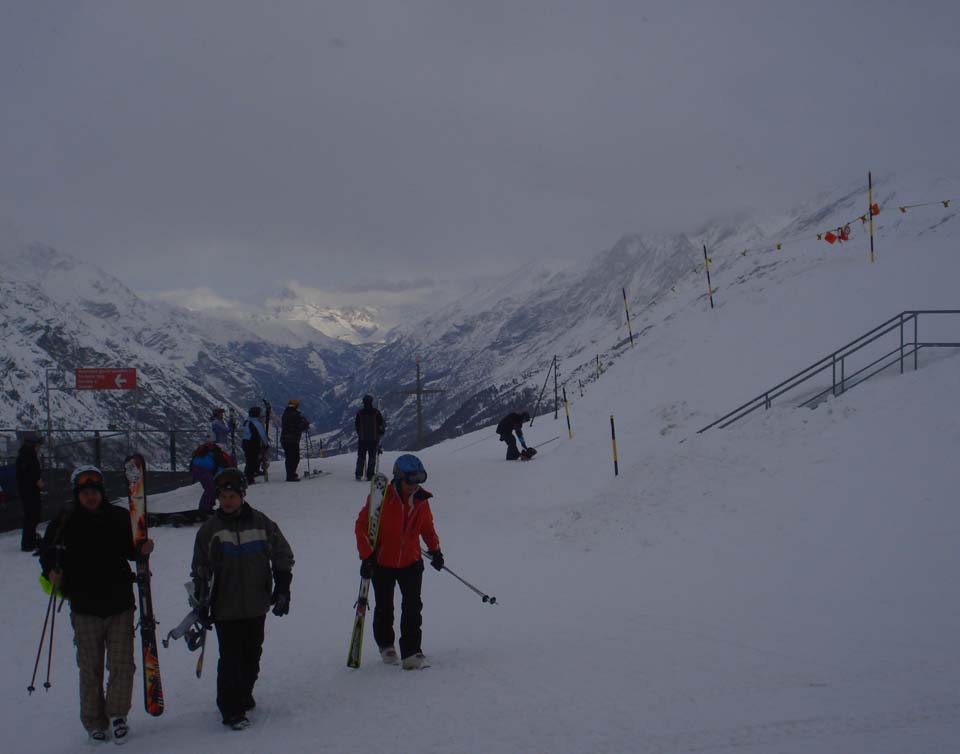 The run descends to Riffelberg and is a swooping rollercoaster of a run that leads directly to the sun terrace of the Riffelberg hotel where hot chocolate awaits. The problems began right away - my skiis would not slide. Very odd. I stood on a slope, pointing down the fall line, and did not move. Dh finally admitted he'd coated the skiis with WD40 when he stowed them in the garage after our last trip.