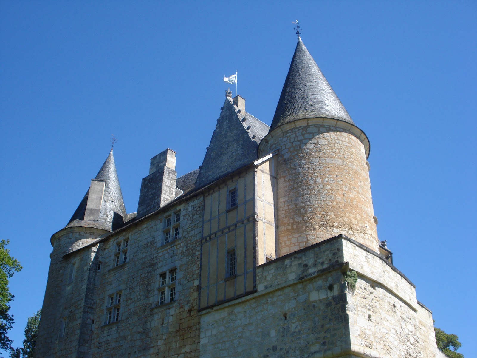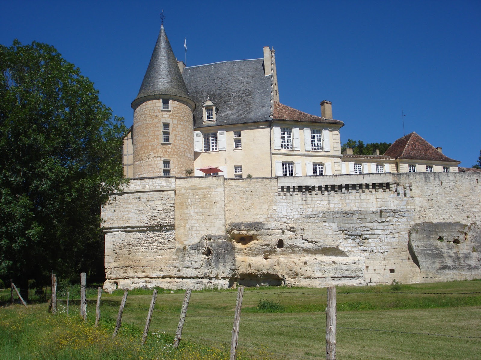 The ChateauOn our way back from Bergerac yesterday we stopped so I could take photographs of the rather lovely Chateau de Montastruc near the river Caudeau. Every time we pass the gap in the greenery that signals the narrow side road leading to the chateau, I snatch a glimpse of it. This time I was determined to look more closely. Built on top of natural limestone, the chateau rears up into the sky, and someone, at sometime, carved chambers out of the limestone at ground level. Click here to view the Chateau's own website. For those proficient in the French language, you can read it in that language, but I have taken pity on those who struggle as I do, and the link takes you to the English language site.