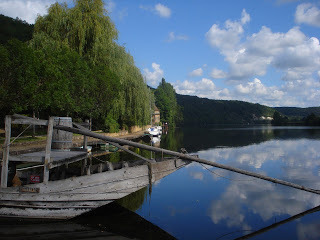 old ferry boat above the barrageWe biked along, admiring the expensive houses with gardens running down to the water and wondering why there were so many notices declaring Danger! And finally reached the barrage at Mauzac les Baudies. The barrage is ugly from one side, but pretty on the other, and it is holding back an awful lot of water. A big board told when it was built etc etc, and explained that sudden releases of water, even in summer, can create vicious surges downstream. Hence all the notices to stay away from the river bank. We spent time in the little village, admiring the new sailing boats and the old wooden ferry boat that has weathered to a silver grey. Only the oars were new! We wandered among the old buildings, and then cycled back along the same route.Sunday morning we decided to attack the invading brambles and nettles beside the pound, which is wht they call the atreams that direct water into what was once the mill pond. When we’d got the patch clear enough to walk to the top of the bank and look down at the stream we cleared out last year, we saw it was full of weed again. I attacked it with a garden rake, and dragged out weeds until dh said ‘There’s a snake!’ Sure enough, a yellow and black head emerged out of the water and weeds. I shot up the bank away from it, rake held at the ready. Then we saw it wasn’t a snake, but a lizard of some kind and felt guilty for disturbing it. When we looked it up on the internet, it’s a fire salamander. http://en.wikipedia.org/wiki/Fire_Salamander