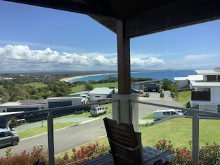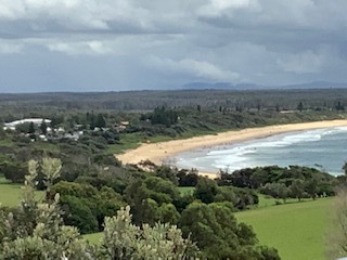 Next day Bill and I took a quiet walk on the beach for an hour in the sunshine. Only dog walkers and a few surfers were out that early - it was around nine thirty. Ten years ago we set out to walk from end to end of the beach you see in the picture - Diamond Beach - and we never made the whole nine miles. This time we did not attempt anything so ambitious. From the house it is an easy walk over the grass to the lookout point over the Pacific Ocean, and going down the five flights of steps (15-20 steps in each flight) was easy. Going back we stopped and enjoyed the view at every landing.