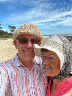 The magpies are croaking outside and the temperature is, as it always seems to be, averaging around 20 degrees. Some days, however, it shoots up to 35 and higher. Our first few days here were of that order and it made sleeping difficult. Overall it is a cloudy sky today but it isn't 9am yet, so there is room for improvement. Even so, there are people on the beach and out walking their dogs - lots of dogs here! - before it gets too hot.
