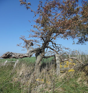 And yesterday I was up very early and out in the fields before 9am and it was beautiful. Blue sky from horizon to horizon, warm sunshine and only three people+dog spotted in the distance - easily avoided. The apple tree is still loaded with fruit which seems such a shame. Like the blackberries that went unpicked, it seems the apples will eventualy fall and be eaten by insects and birds. I pocket a couple as I pass, and I think other people do the same, for the lower branches are not so laden as they once were! But I'm surprised the farmer doesn't come with a tractor and take the lot. Apple pie til Easter!