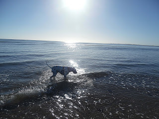 Apart from working hard on the book, we had a wonderful morning on the beach at Druridge Bay on Thursday. The beach is gentle and it was a calm day, so Tim dodged in and out of the water and thought it great fun. At SEaton the sand dips sharply into deeper water and he's not keen on that.