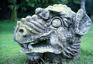 These chimeras were broughtfrom Bishopsgate for ballast:an empty collier sailing backLondon to Newcastle. Ozymandias in a northern park,four heads rest on sober grassas if, landlocked icebergs,their bodies bulked below. No more than emblems,they face rude frosts,gaze from blank orbsthat give away nothing. So odd, they make strangersappear familiar, ghostscome back from years agoto stare them out.The four carved limestone griffin heads that glare across the lawns at Wallington Hall in Northumberland date back to the 16th century. They were brought back from Bishopsgate, London, around 1760 as ballast in one of Sir Walter Blackett's returning colliers. The heads were first used to ornament the surroundings of Rothley Castle - a folly constructed in the eighteenth century deer park at Rothley which is now outside the property. The heads were subsequently moved to a site near the Chinese Pond inside the grounds, to the east of Wallington Hall. It is said they were moved to a spot in the woods and that their wings are still somewhere nearby. They finally found their current resting place on the east lawn in 1928.There are four of them, each slightly different all staring out to the rising sun. The photograph is mine.