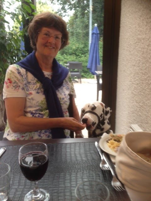 When we order our food and drinks, the waiter, unasked, brought a bowl of water for Tim and he very nearly drained it. Bill ordered a wild mushroom omelette and I chose Fish and Chips. Yes, I know,, but I wanted to see how it would be presented. We waited a long time for it. Pizzas came out faster for people who arrived after us, but there was no hurry. My fish was very white, tasted lovely, and had a very light batter. Frites in a cone came with it, plus a single carrot served with its stalk stub, a little green salad and thinly sliced courgette and lemon, plus a herby sauce. Delicious. I ate every scrap except for feeding Tim a few frites. It kept him quiet instead of threatening to pounce on the pigeon that wandered too close to our table.