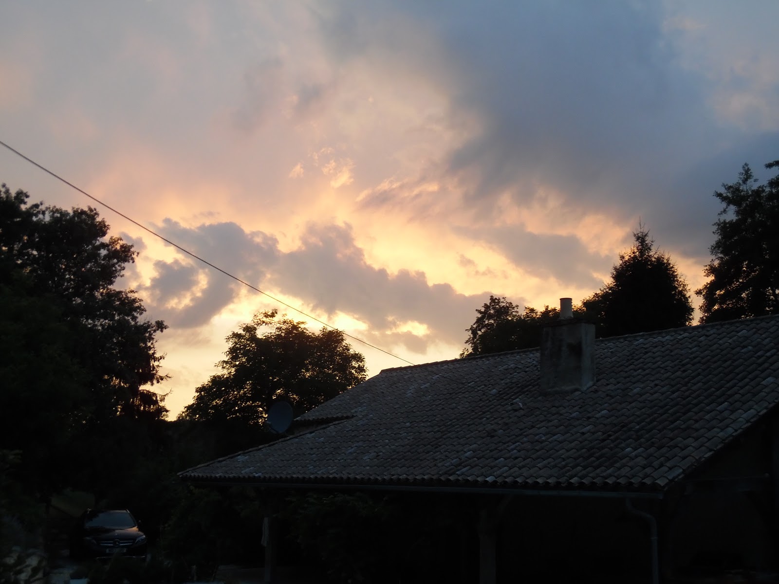 The journey was longer than anticipated because instead of following the sat nav we disagreed with it and took the route we knew. Fine. But then Bill pointed to a sign for Banueil and said Shall we go that way? In the split second of decision time I said why not. Big mistake. We saw a few pretty villages, some old, one very modern, but ended up back in Lalinde. Well, no, not quite. We came out on the Porte de Cruz on the canal and had to drive nearly all the way to Bergerac before we were reasonably sure that a right turn would take us home. We ended up joining the D21 at Lamonzie. From there, a straight run home, a quick walk with Tim and then we got in and hunkered down, because the rain came down. Real rain.