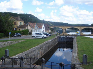 Lamonzie MontastrucA lazy morning and down to Lalinde in time for a longer walk by the canal – yes, it is a canal – le canal du Lalinde and then into the square for lunch. Bill ordered bavette, which turned out to be Charolais steak and I order the mushroom omelette. Both turned up with not chips but sliced potatoes with their skins on, curled up and slightly brown. Like chips, but not chips. Not fried. We think they must have been done in an oven, and will experiment when we get home. Tim liked them. Eight euros cheaper, even with the beer, than the other café we tried last week. On the plus side they brought water for Tim, but none for us. Today we received chilled water in a thermos bottle, but not for Tim, so we gave him water in a clean ash tray. We felt the first few drops of rain as we walked back to the car, and raced the black clouds all the way home.