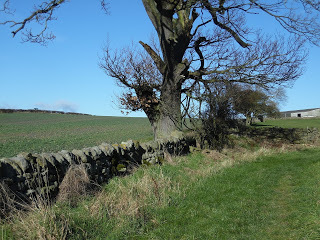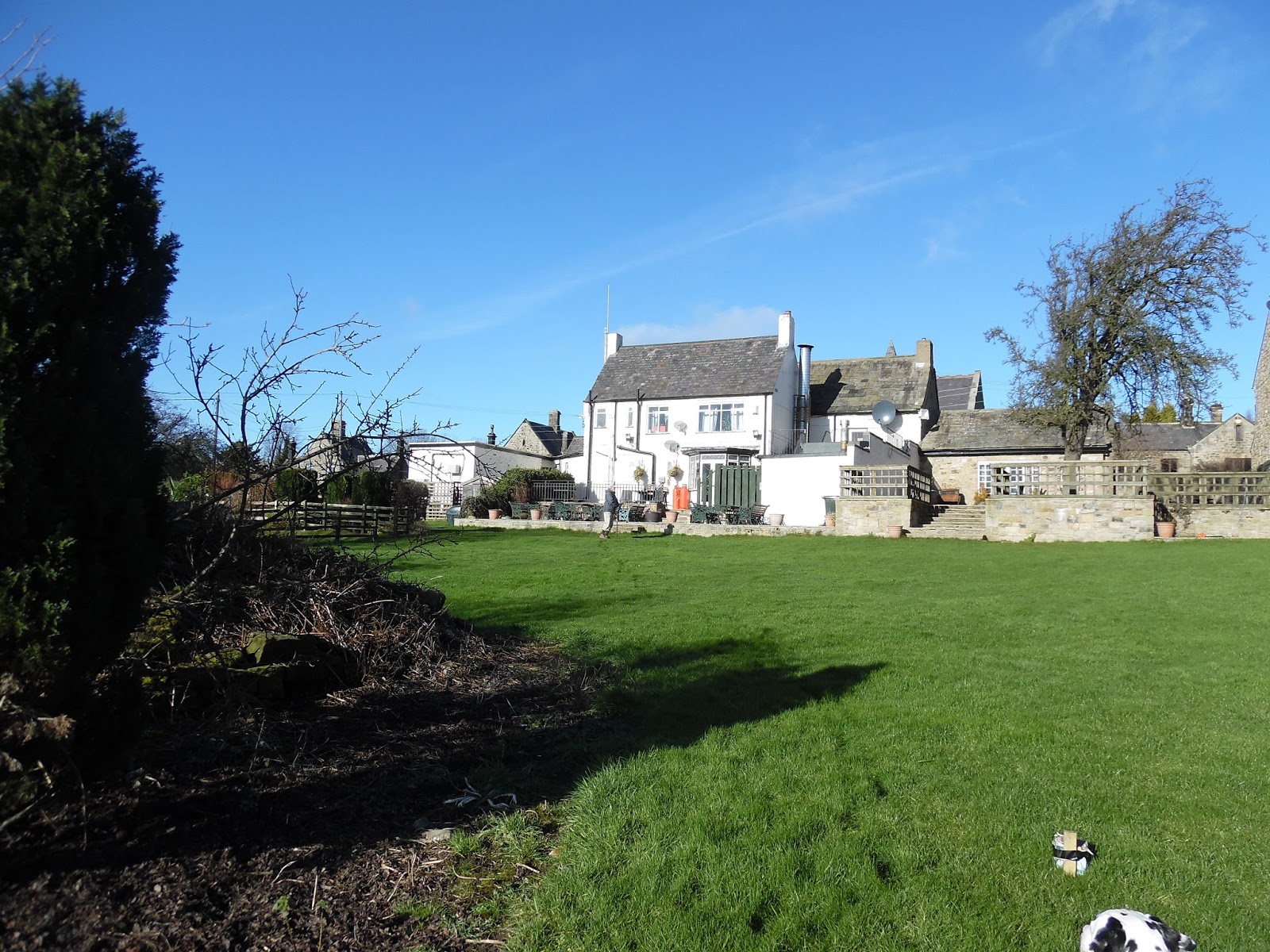 Yesterday was the same, weather-wise. Too gorgeous to sit around indoors, so I persuaded dh to walk up to the Lion and the Lamb where he could have a shandy and a bowl of chips (and a well earned sit down!) before setting off to walk back. I would call that bribery exactly, but it did add a certain something to the walk. The outward journey is all uphill, though the footpath winds around fields which makes the incline not too bad and the whole hillside is orientated south so we were in sunshine all the way. Tim scampered about running forward and back sniffing everything and nothing.With the village of Horsley showing up on the horizon, I asked dh if he was looking forward to his shandy. "It'll be a pint of beer, not a shaandy," he said. We sat in the garden at the back of the pub, still in sunshine, and sure enough, he had a pint of Black Sheep with his bowl of chips.