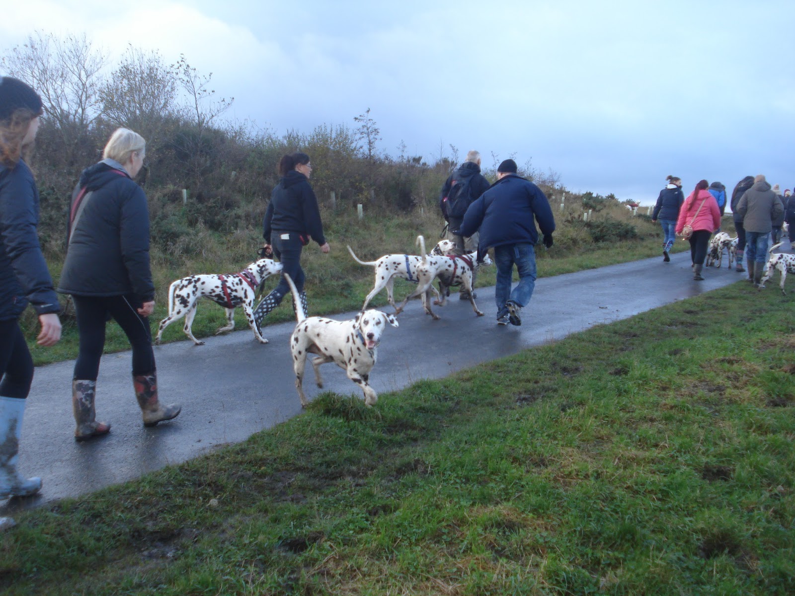 It was a dull, cloudy day and the ground was waterlogged after so much rain. That wasn't a problem. Wherever we walked, the problem would have been the same, and Dalmatians need their daily exercise. Everyone was equipped with waterfproofs and wellies and prepared to give their dogs a bath when they got home. The fact that quite a few had become grey or even black dogs just seemed funny, because others stayed spotlessly (sorry!) white. Tim was raring to go while on the lead so I let him loose so he could run with the others, who were haring off in all directions. He ran a little way and then hesitated, not knowing which way to go or which dog to follow. Then he turned round and couldn't see me in all the confusion. Panic! He set off at top speed back to the car which all things considered was a sensible move on his part, except that I was only ten feet away in the opposite direction! Lots of calls and whistles brought him back. Every time he lost sight of me there was a moment of panic, but eventually he got the idea and began to run with the others. He and a young lady called Nova seemed to take a fancy to each other. It was such fun for him, and next time he'll be more confident. The added plus was that he slept for the rest of the day!