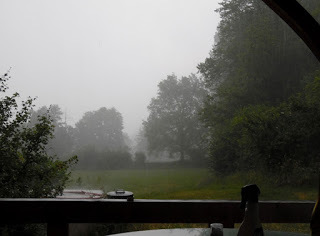 Ironically, now the good weather has gone, the pool is open and almost ready for bathing. We've had a couple of days of thunder storms and plodding about in wellies and waterproofs but the forecast is for scorching days again starting on Wednesday. Two small frogs had to be rescued from floating gently round and round the pool on the first morning. DH's tally of mice captured and killed is now standing at six and we have not heard the patter of tiny feet nor the clang of a mouse-trap for several days, maybe over a week. At least it seems to do the job instantaneously as I haven't heard a single squeak of surprise or pain. Local dogs visit and play with Tim. One is Baloo, a rather large black and white collie who lives at the first wooden house up the hill. The other is a brown labrador type who is only interested in plunging in and out of the pond and the river. The other visitor is rarer but easily the most playful; an Alsatian cross of some kind I would guess who doesn’t wear a collar. He is great fun and motors around like a motorcyclist on a race track.