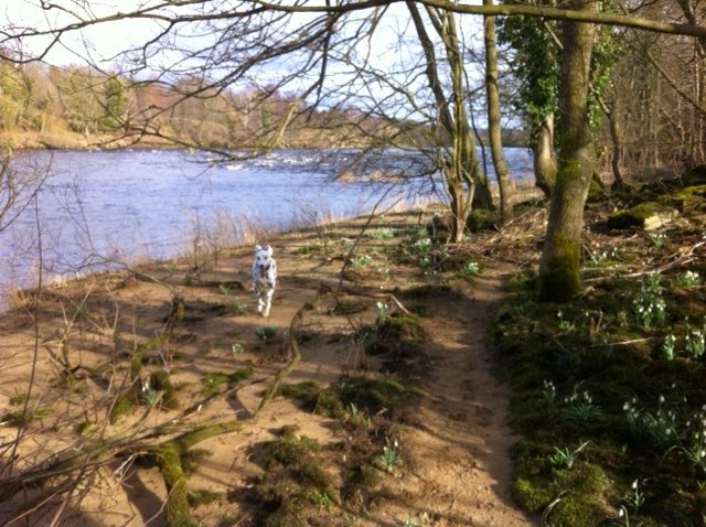 The snowdrops are in full bloom on the riverside, and this year they are not fighting their way up through snow. Not in my part of the world. They are having it easy-peasy with sunshine and temperatures around 4-9 degrees C. Crocus (crocki?) are showing upright yellow spears in the garden but have not opened up yet. I'm trying to keep Tim off the newly sprouted daffodils. Last year he kept eating the flower heads, silly boy.