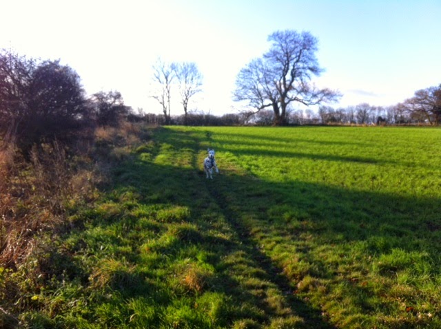 Walking with Tim is a slipery-slidey task these days. We've had one good day of frost when the ground was hard and silver with frost. Tim went out in his overcoat - the temperature had dipped below freezing overnight. He trotted out looking very pleased with himself. The frost had gone by lunch time, the overcoat went back on the hook and the ground turned to mud again, The fields are green, winter wheat is growing apace in the fields. The lawn looks a mess because it is still growing but too soggy to cut. 2014 has been the strangest year for weather that I can remember.