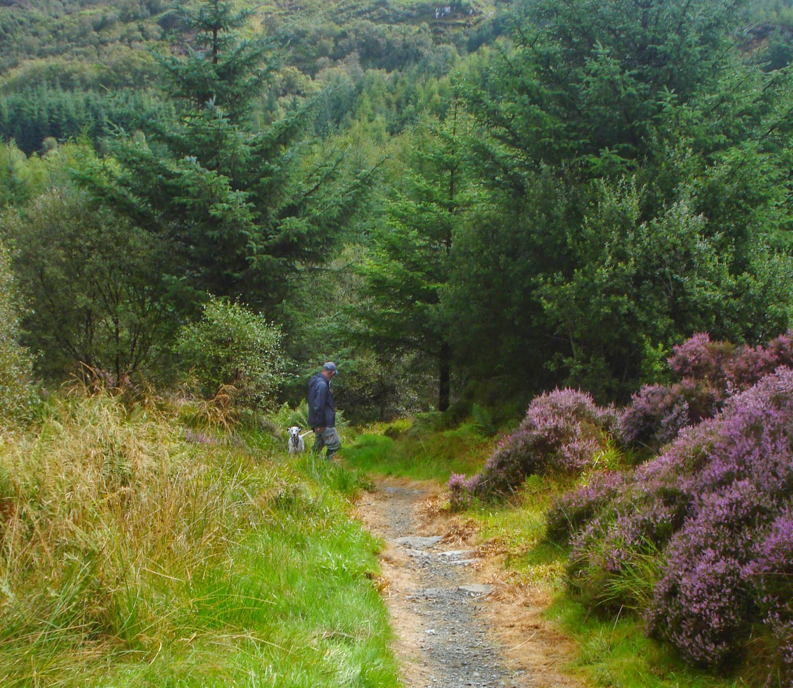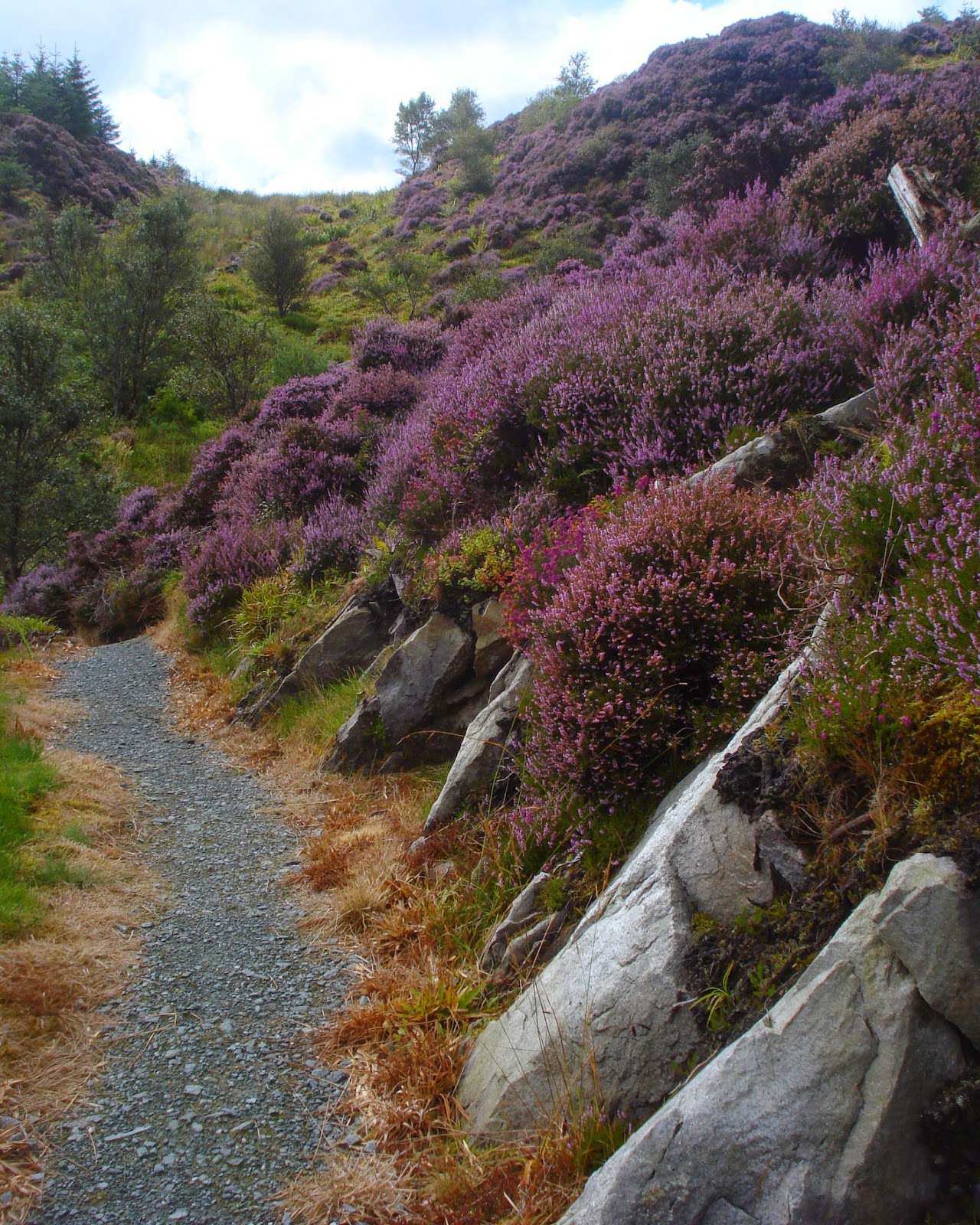 The walk was listed as a three-hour walk and we did it in three hours ten minutes - and that included a lot of short stops to enjoy views. The first hour was all uphill, zig-zagging up the hillside through ancient woodland with the sound of water in our ears and every shade of green around us.The gravel track soon became a grass track interspersed with boulders, and the trees towered over us. Every so often a curve in the path would offer a spectacular window-view through the trees.