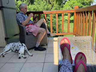 Back in England after three weeks in France.Those three weeks were hot weeks, usually 28-32 degrees around midday. At that point we retreat into the shade of the bolly, or lounge on the balcony on the other side of the house where there is some shade to be had. By evening, the sun is fully round and the balcony becomes the place to enjoy a drink after dinner.