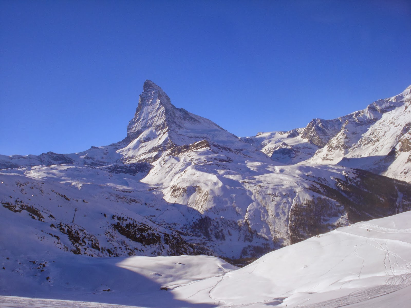 Let's just say I know people are not interested in my day to day activities while in Zermatt. You've heard it all before, and I don't want to watch your eyes glaze over with boredom! But if you want a place that is pretty, stylish and expensive, it's the place for you. The skiing is wonderful,with 360 Km of pistes and masses of off-piste if that's your thing. After the Michael Schumacher incident, you'd think many would decide to stick to the groomed runs, but from the chair lifts we could see slope after slope covered in ski and board tracks all heading off into the unknown. One pair of tracks disappeared over the edge of a cliff - goodness knows where they ended up - especially as I think it was an area designated to wildlife. If they survived, and got caught, their lift passes would be revoked. We stuck to the corduroy where the piste-basher had flattened the snow, so we didn't go and peer over the edge to see if they'd survived.The prices are high, as everyone complains, but you get quality in everything in return. A plate of frites cost 8.50 Swiss francs, a beer 9.50, so at an exchange rate of 1.4 francs to the pound sterling, lunch on the mountain every day cost around £12. Expensive, yes; but consider we were at at 8500 feet up a mountain; the chips were freshly cooked, hot and crisp and the bottled beer straight from the cooler. With the sun shining, we sat on the restaurant terrace, a rug over our knees as we ate and watched the antics of the kids on the nursery slopes outside the Riffelberg Hotel or turned the other way to gaze at the Matterhorn. We could have bought a bottle of Moet & Chandon instead of beer if we wanted.