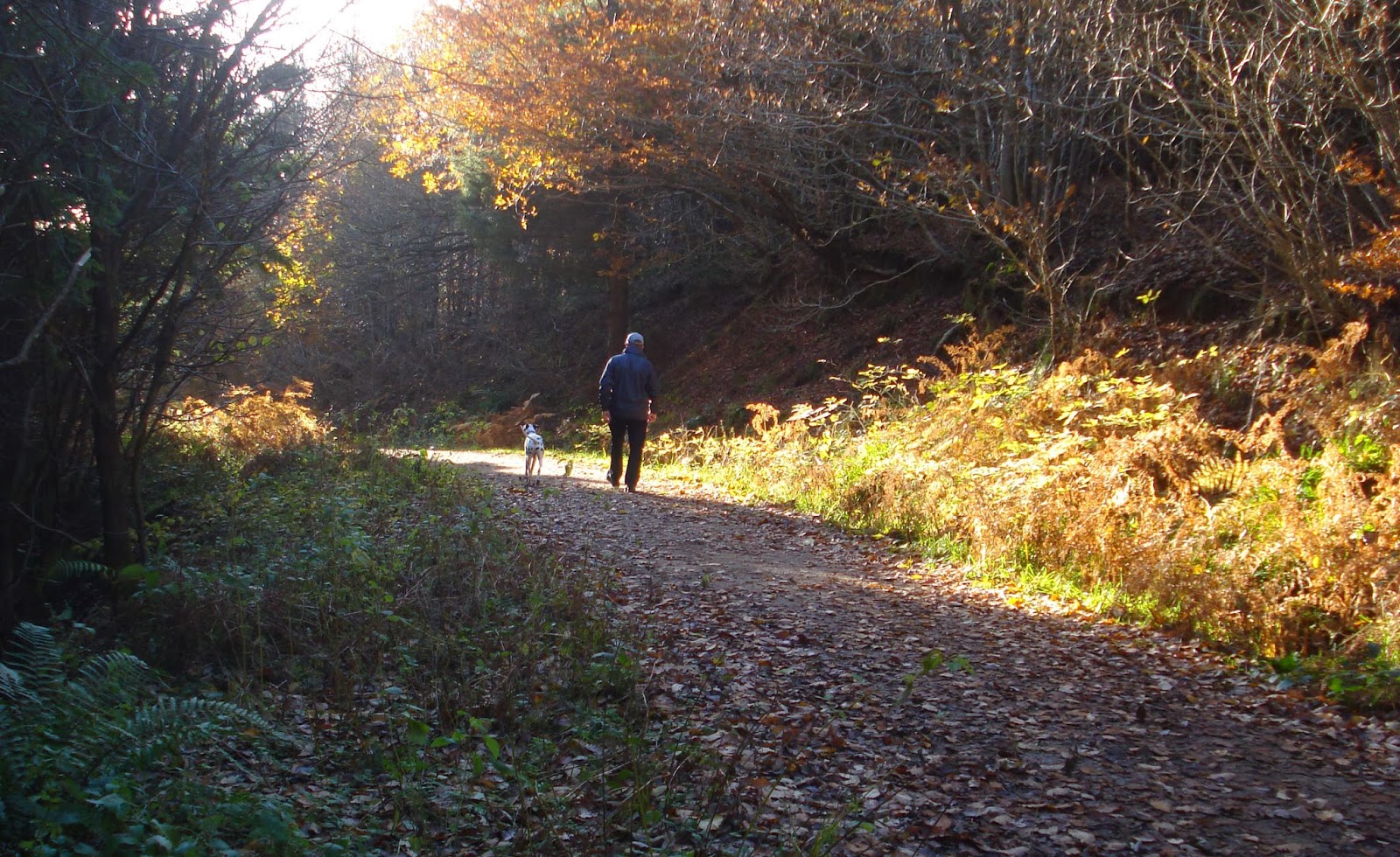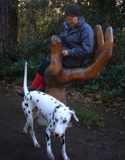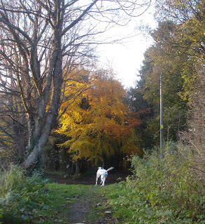 Talking of photographs, I won't be taking many now until the frost and snow arrive. We still have an occasional bright day as in the pic of dh and dog in Chopwell Wood last week, but the horrendous winds of Thursday and Friday ripped the the last of the leaves off and brought down branches galore. The autumn colours have all but gone, the leaves are sodden underfoot and the trees are stark skeletons against a grey sky.