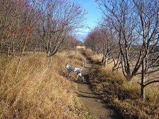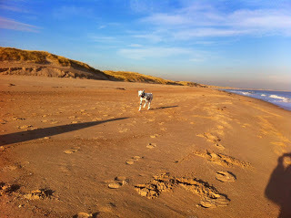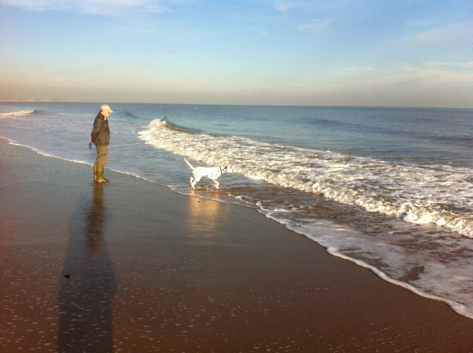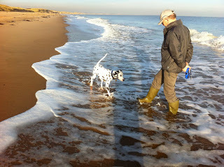 A day out today! The weather looked good, the forecast promised sunshine, and for December the temperature was high. So off we went to Druridge Bay, just south of Amble on the north-east coast. Lindisfarne was a tiny triangle of white on the horizon. One day I must go and visit the castle there.Today was a walk along the beach and back again while Tim ran in and out of the sea, gaining confidence as he went along. Just like a child, really - he splashed through pools of standing water, and explored every nook and cranny of the patch of rocks we discovered. All the time the sun was warm on our faces and then on our backs as we followed our footsteps back to the point in the dunes where we came down. Important to get it right as the beach is over seven miles long and a mistake could have extended our walk far more than we intended!