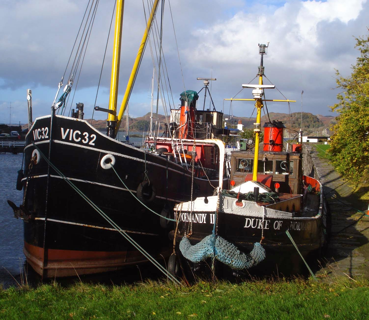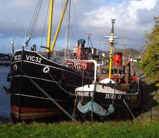 Drove off for a two-day break on Wednesday morning. If you want to track my journey, then head west along the A69 from Hexham and then turn north onto the A689, then the M6 which becomes the A/M74 north of the border. Swing south west of Glasgow and cross the Erskine Bridge over the Clyde (roadworks! but no delays) and then join the A82 heading north along the side of Loch Lomond. Turn left at Tarbet, onto the A83. Follow that road as it twists and turns through Arrochar and Inveraray until you get to Lochgilphead. Once there, turn onto the A816 and then onto the B841 at Cairnbaan and follow the Crinan Canal till you reach Crinan. Our hotel overlooks Loch Crinan, and I mean overlooks it.This journey took us five hours, give or take a minute here or there. The longest stop we had was to give Tim and ourselves a chance to have a pee on the M74 - we went into the service station, natch - and to change driver as we reached the A82. Lovely drive with sunshine and autumn colours just taking over the trees and hedgerows. The two old beauties in the picture were snuggled up together in the canal basin at Crinan.