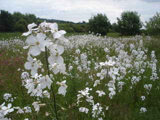 I know I've been waxing lyrical about the abundance of wild flowers this year, but now I'm beginning to think it's all too much. Took a delightful walk in good company yesterday by the river bank in Corbridge and began sneezing on the way back. Sneezed all the way home in the car, and got a fright when I looked in the mirror and saw the whites of my eyes had swelled up around the iris and turned a sort of bloodshot yellow.Last night was not comfortable at all, even with the introduction of a glass of red wine. This morning most of the swelling has gone but my right eye is still red and itchy. I took Tim for his early morning gallop on the field behind the house clutching a big white hanky to my nose, much to the amusement of kids going by to get to school.