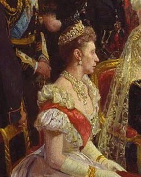 Louise of Sweden, Queen of Denmark (as Crown Princess) (public domain)Princess Louise’s namesake daughter, Princess Louise of the Netherlands, married the future King Charles XV & IV of Sweden and Norway in 1850, and she inherited her mother’s tiara in 1870. She never got to wear it, as she died shortly thereafter. The tiara was left to her only surviving child, yet another Louise. This Louise married the future King Frederick VIII of Denmark in 1869.