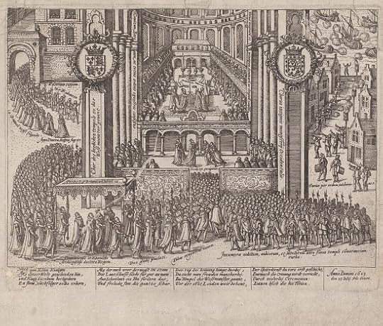 A spectator later wrote, “Queen Anne went to her coronation in a robe of crimson velvet with her seemly hair hanging down on her princely shoulders and on her head a coronet of plain gold, followed by the ladies of her household in their crimson velvet robes. She so mildly saluted her new subjects that the women weeping cried out with one voice, ‘God bless the royal Queen. Welcome to England. Long to live and continue.'”3 During the ceremony, Anne refrained from taking the sacrament according to the Church of England. She was seated next to James on a somewhat lower throne than the coronation chair.