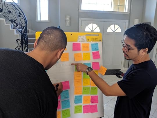 Now that we knew where our audience was before and after the book, it gave us a good idea what knowledge the reader lacked. We then listed everything possible that could help the reader get from point A to point B on separate post-it notes. We then put them on the wall and started organizing them together.