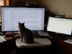 One of the first questions we are asked when we say that we write together as a couple is “How do you do it?” The simple answer is: together! Here is a picture of our computer setup (complete with our feline critic).